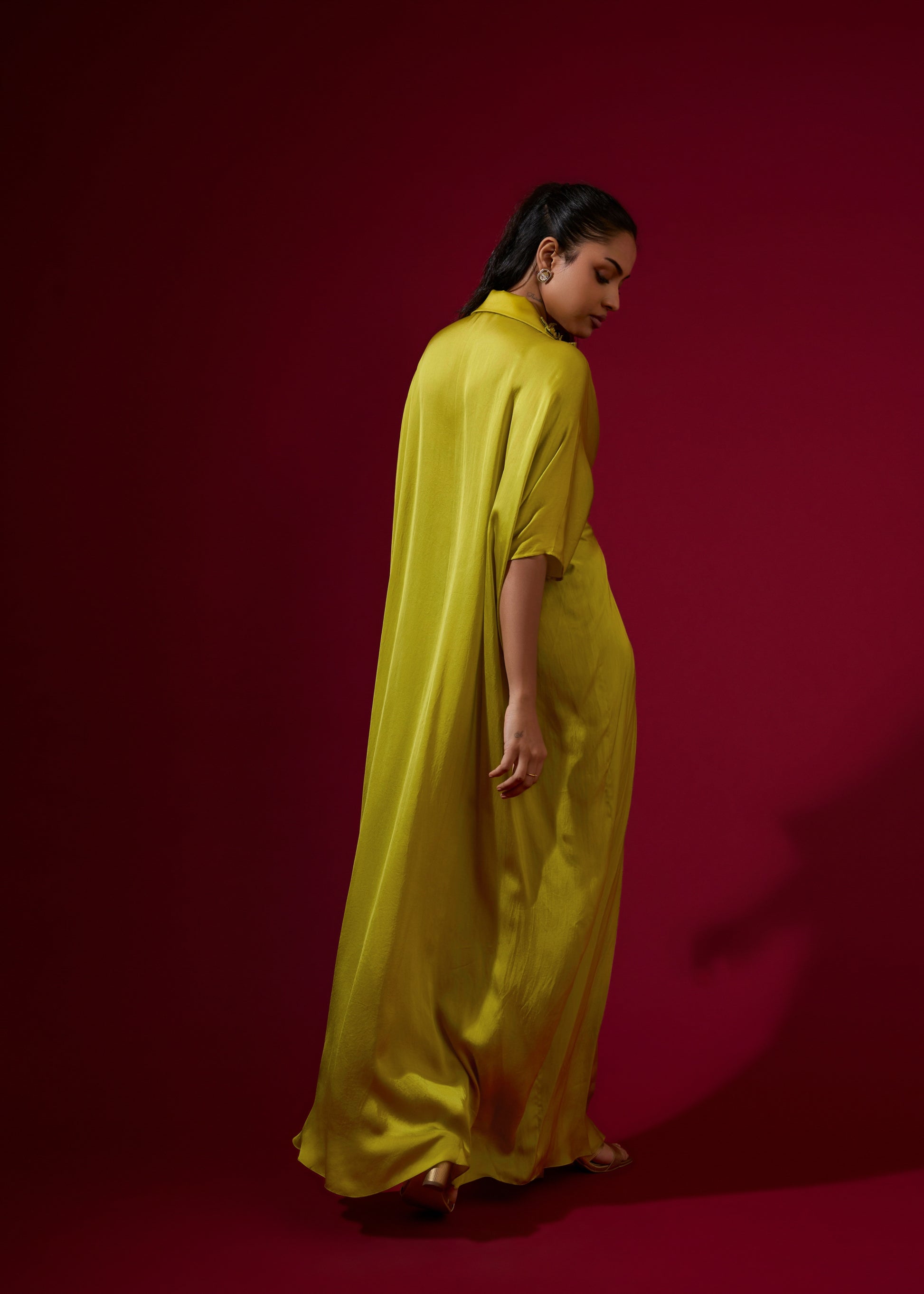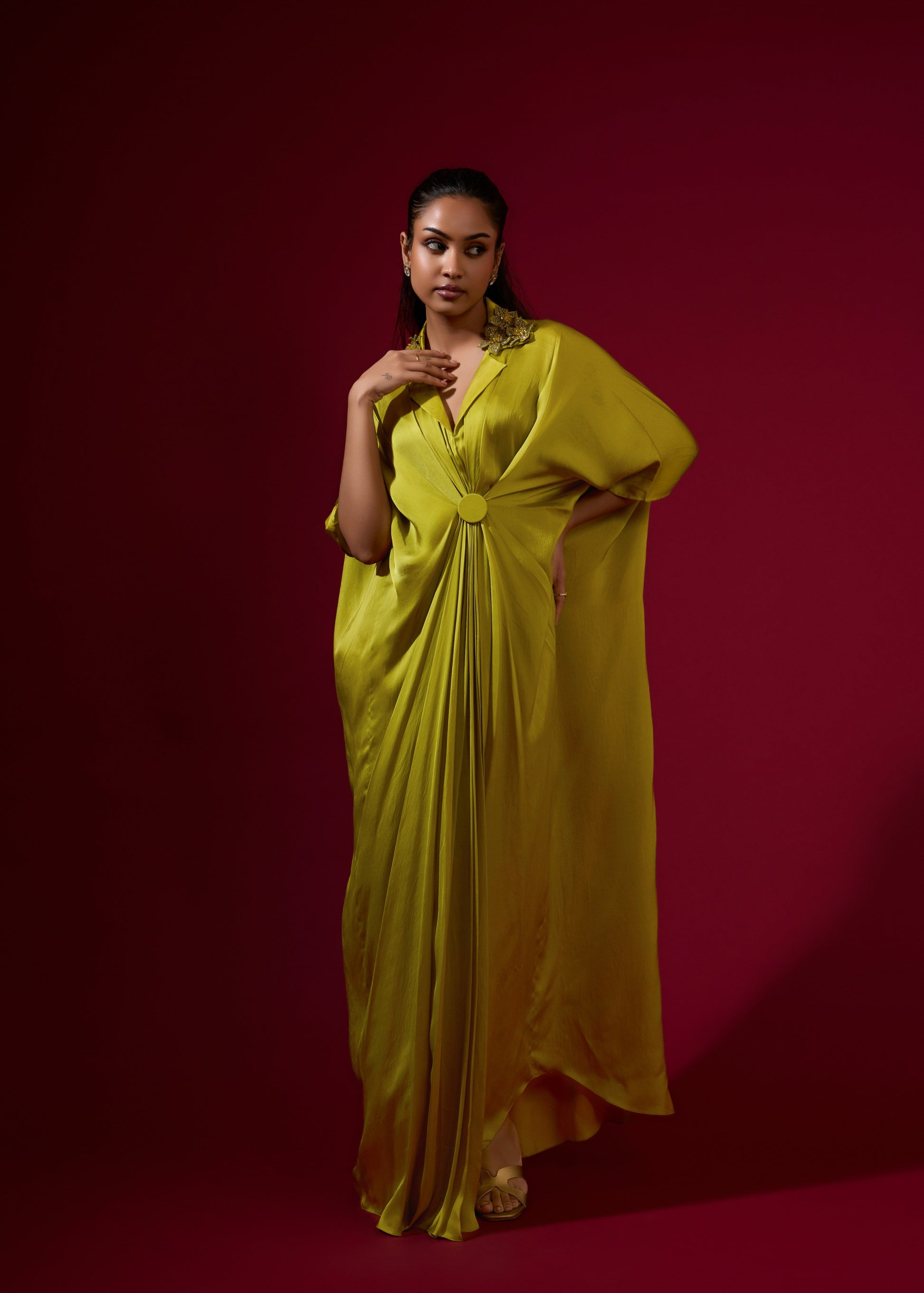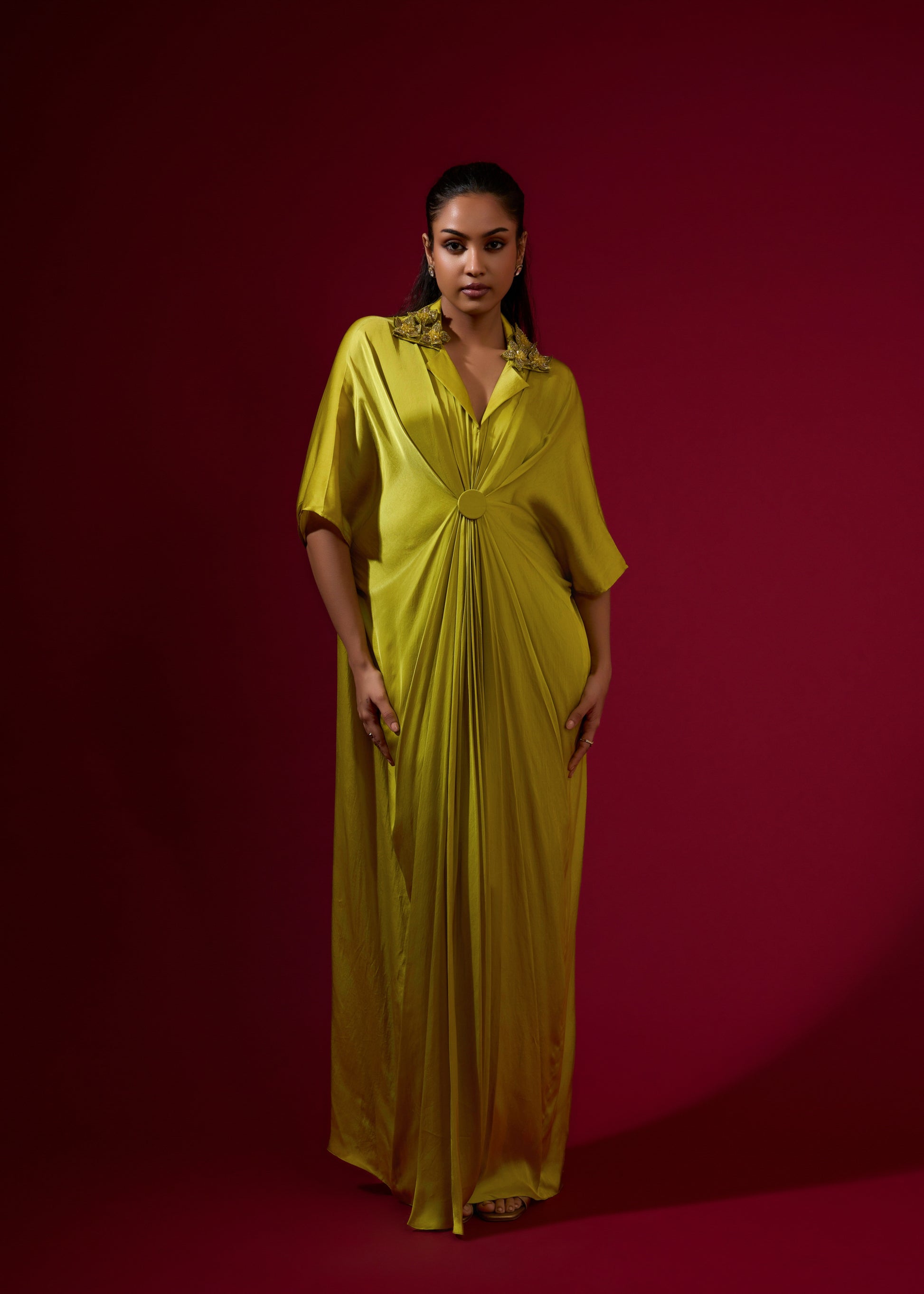 Crafted in silk satin this kaftan features a ring that creates gentle drapes across the silhouette. Finished with a statement 3D floral brooch at the collar, it’s a blend of softness, structure, and sculptural detail.