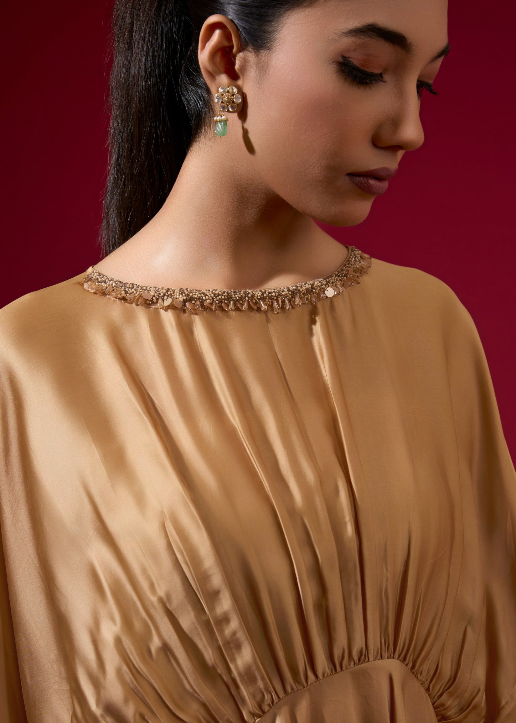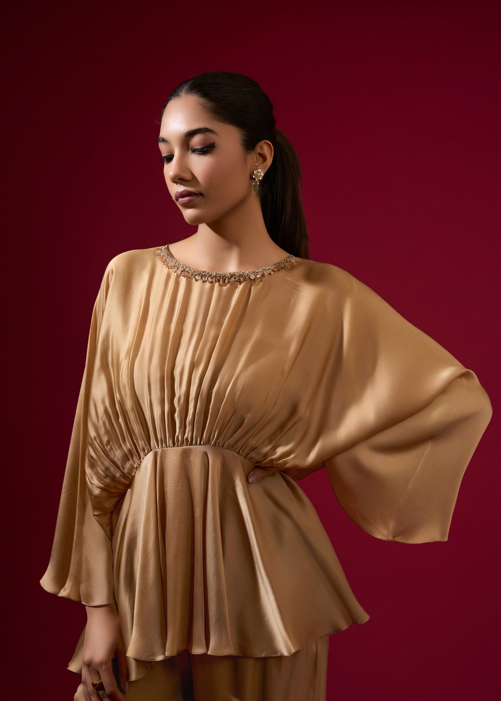 A graceful ensemble featuring a cowl-neck top with fluid, draped sleeves and a defined seam under the bust for subtle shaping with a delicate hand embroidered neckline. Paired with tailored trousers, this set balances ease with elegance.
