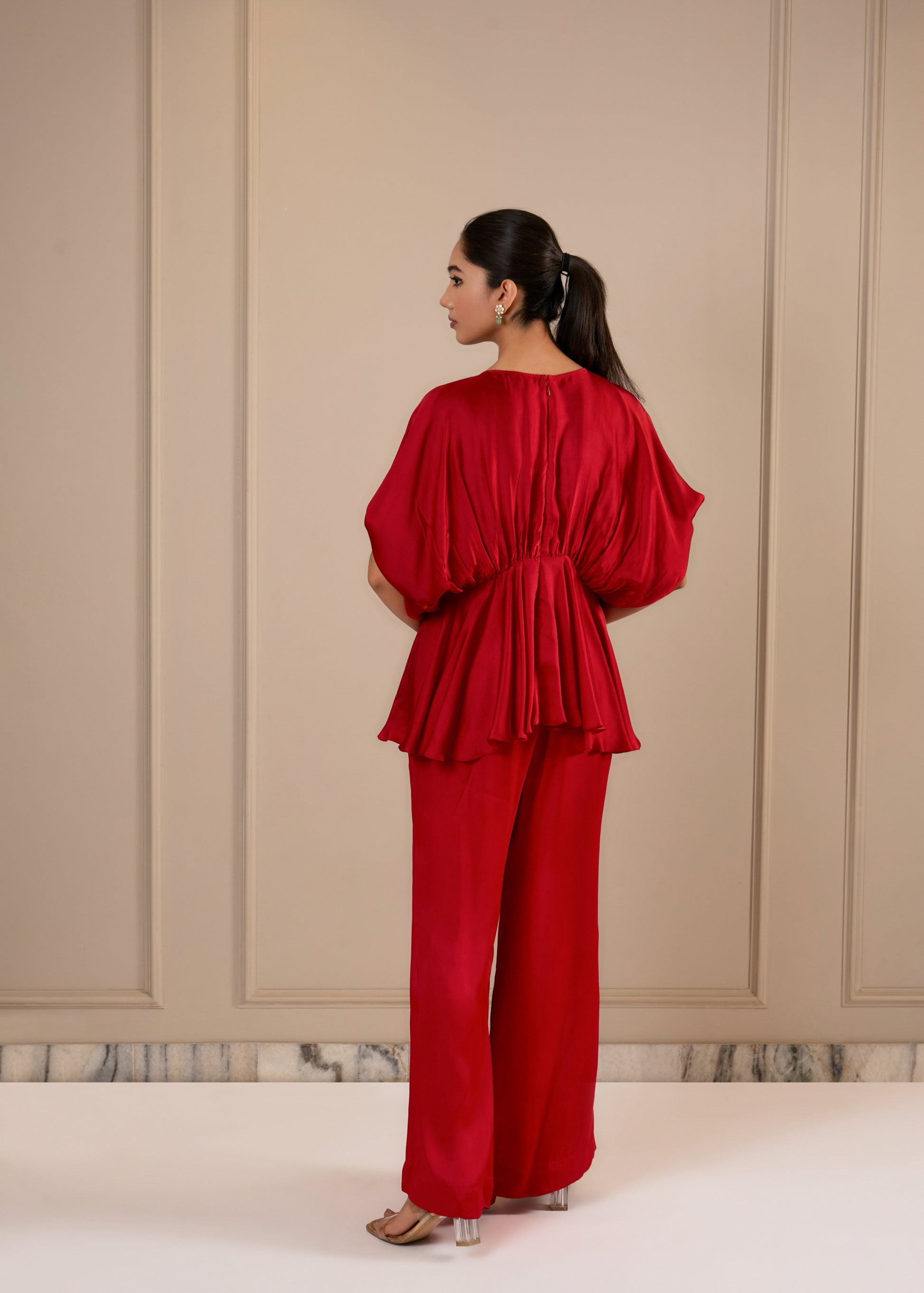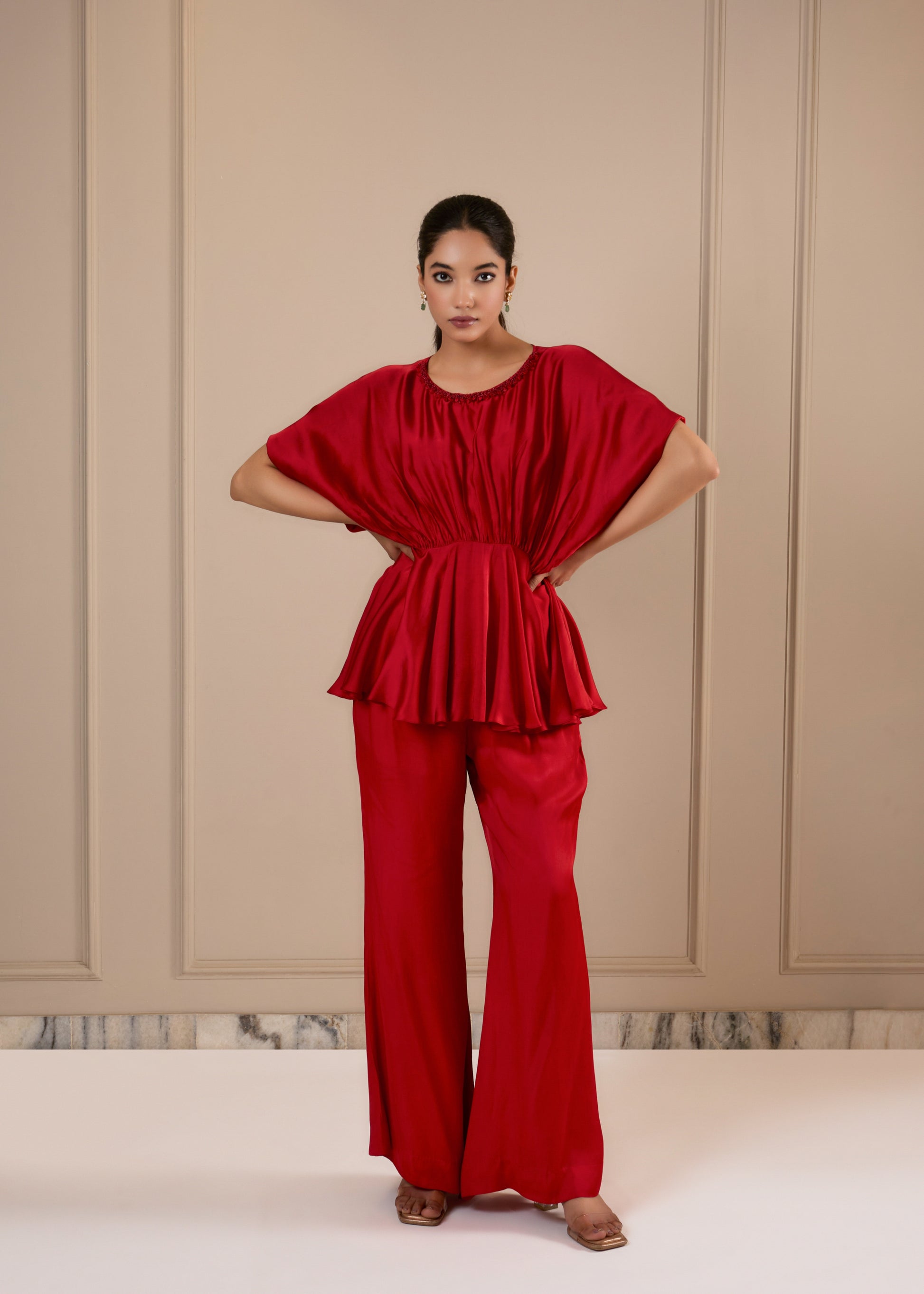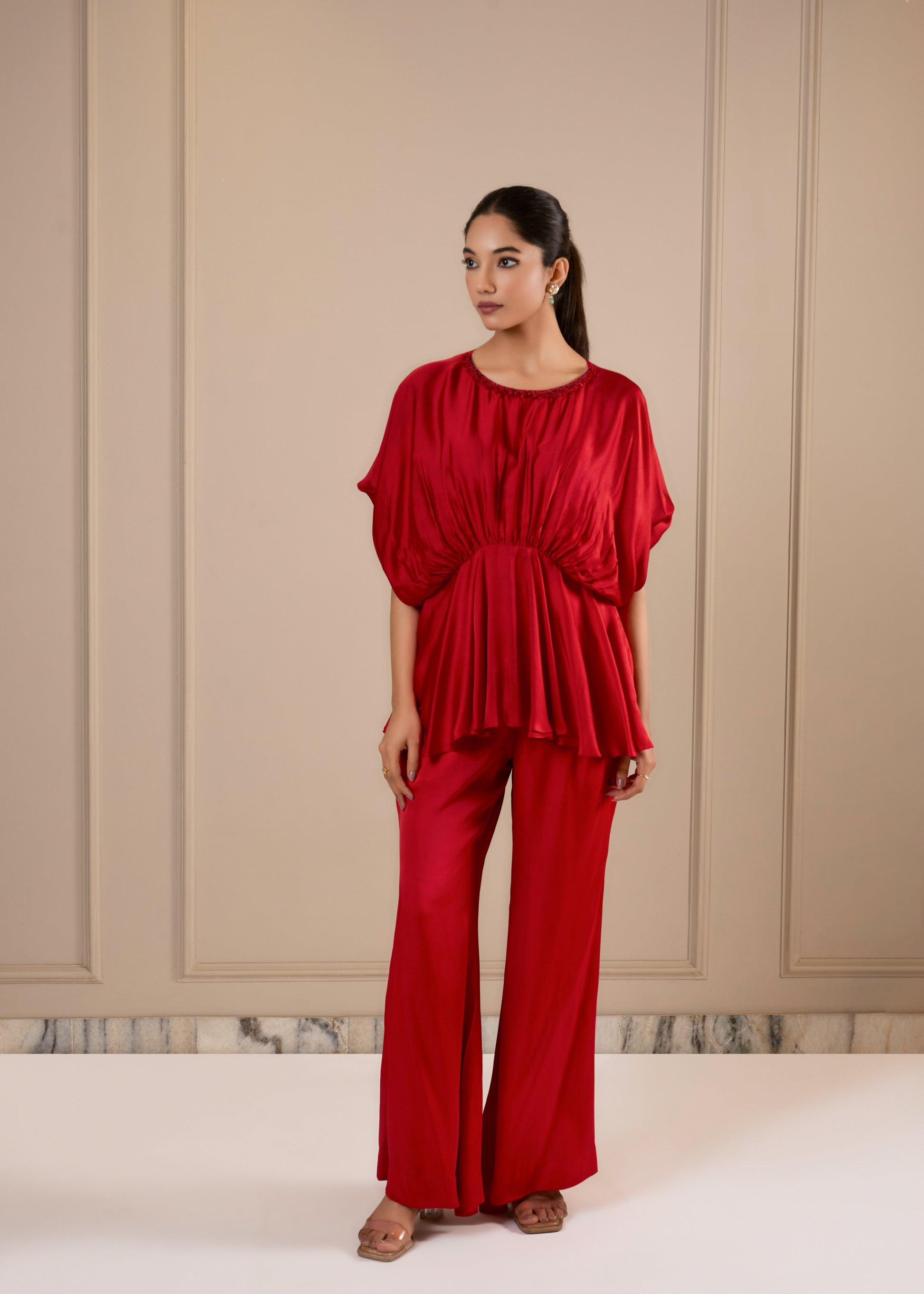 A graceful ensemble featuring a cowl-neck top with fluid, draped sleeves and a defined seam under the bust for subtle shaping with a delicate hand embroidered neckline. Paired with tailored trousers, this set balances ease with elegance.