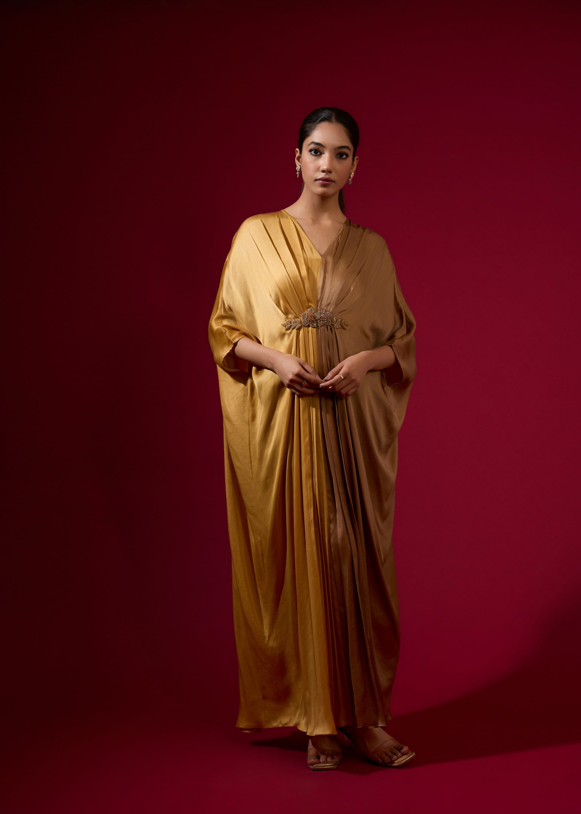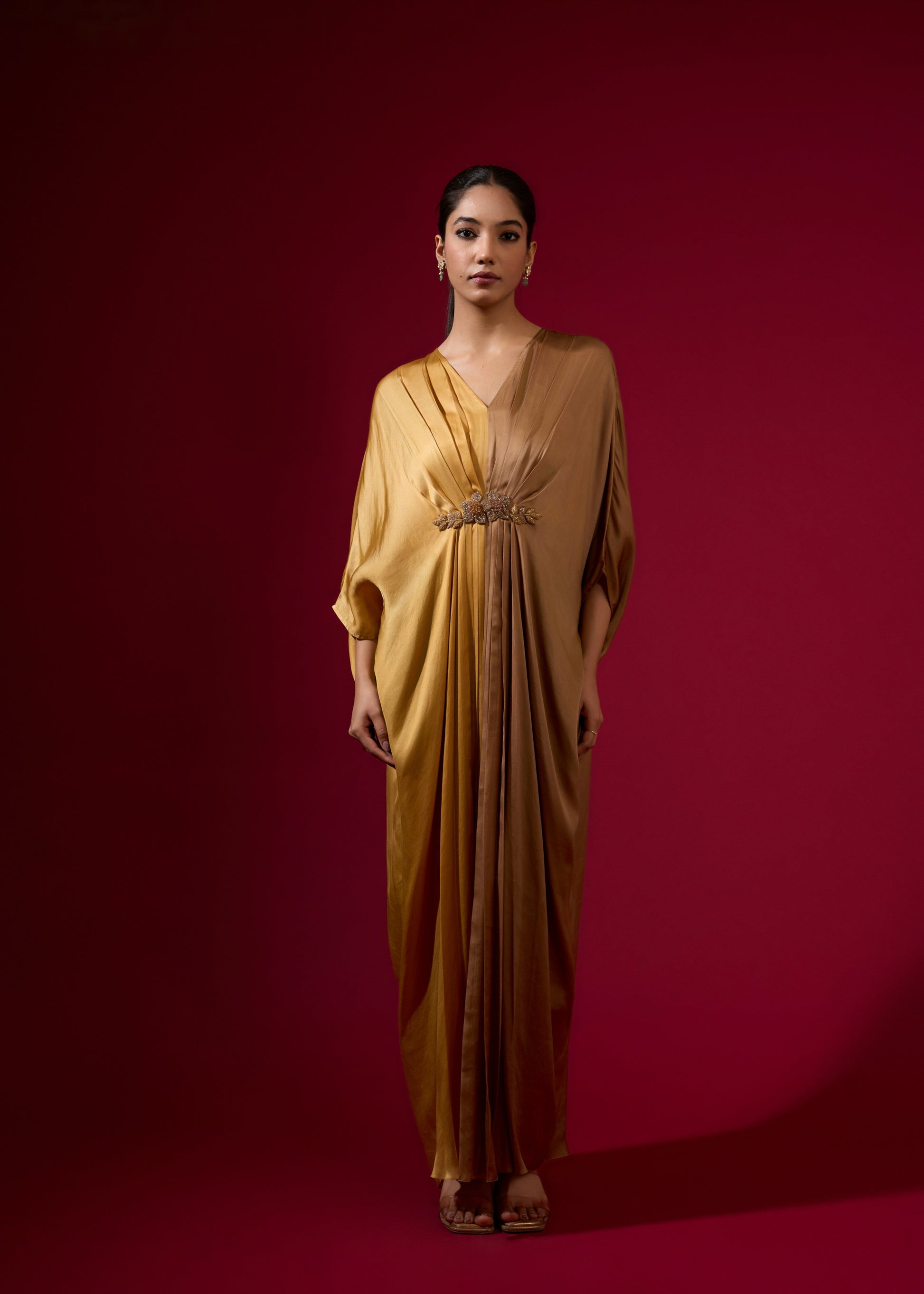 A statement kaftan in striking color blocks, designed with a relaxed silhouette and a cinched waist detail. The centerpiece—a hand-embroidered brooch at the mid-waist—adds a refined touch to this bold, effortless look.