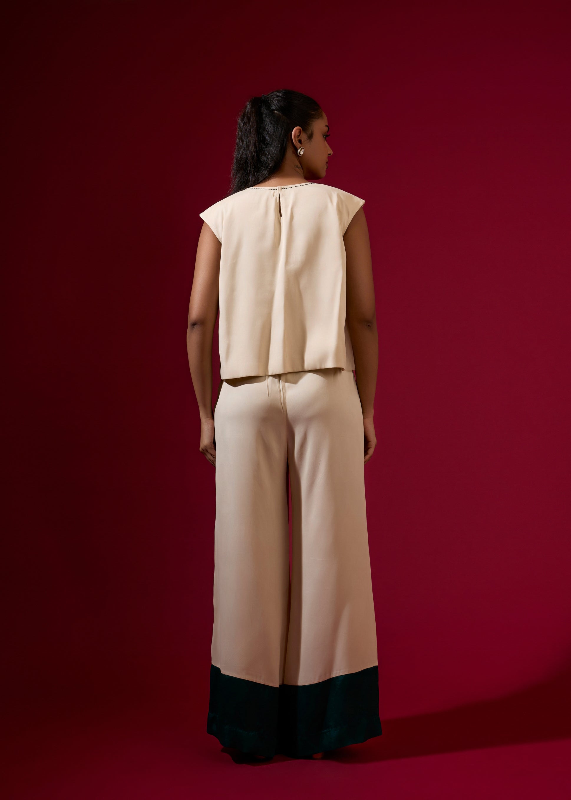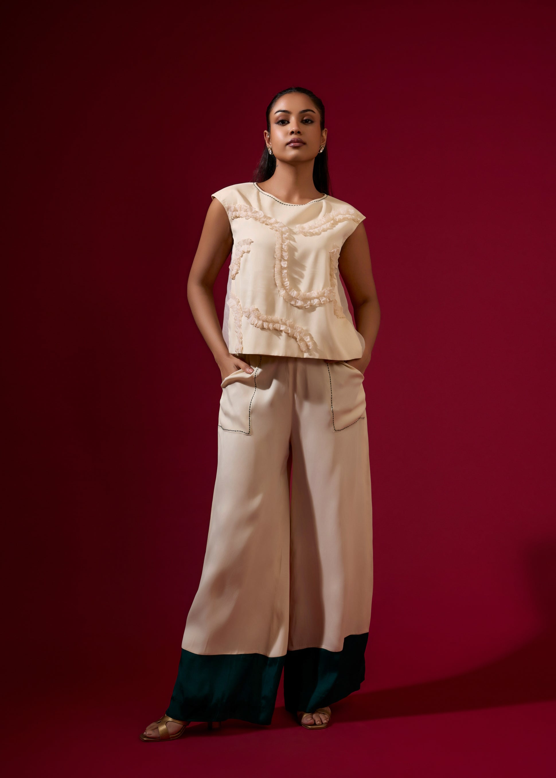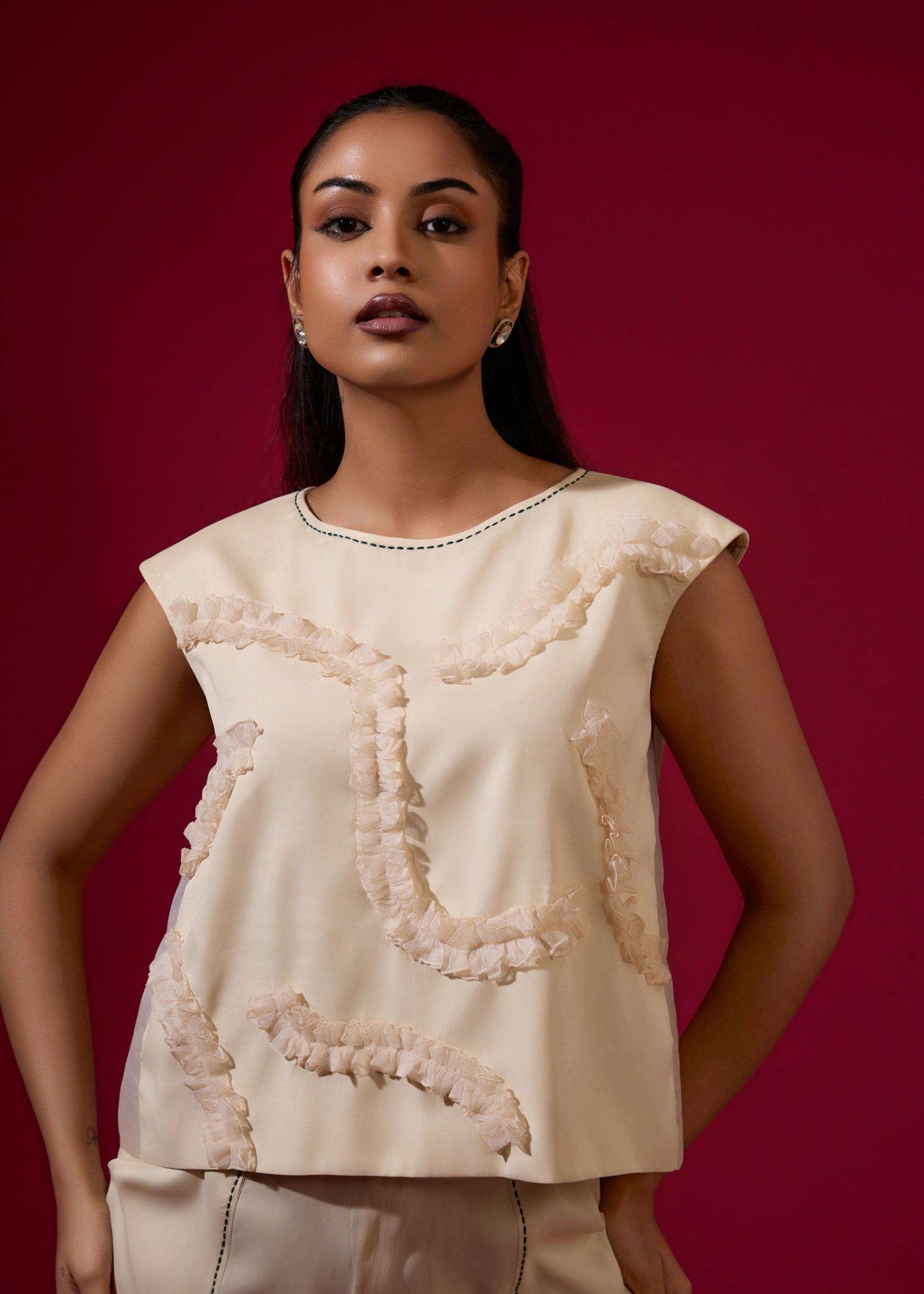A sleeveless top with structured shoulders, featuring organza ruffles and a contrasting anchor stitch detail at the neckline. Paired with trousers that echo the stitch detail on the pockets, this coord set balances feminine flair with tailored sophistication.