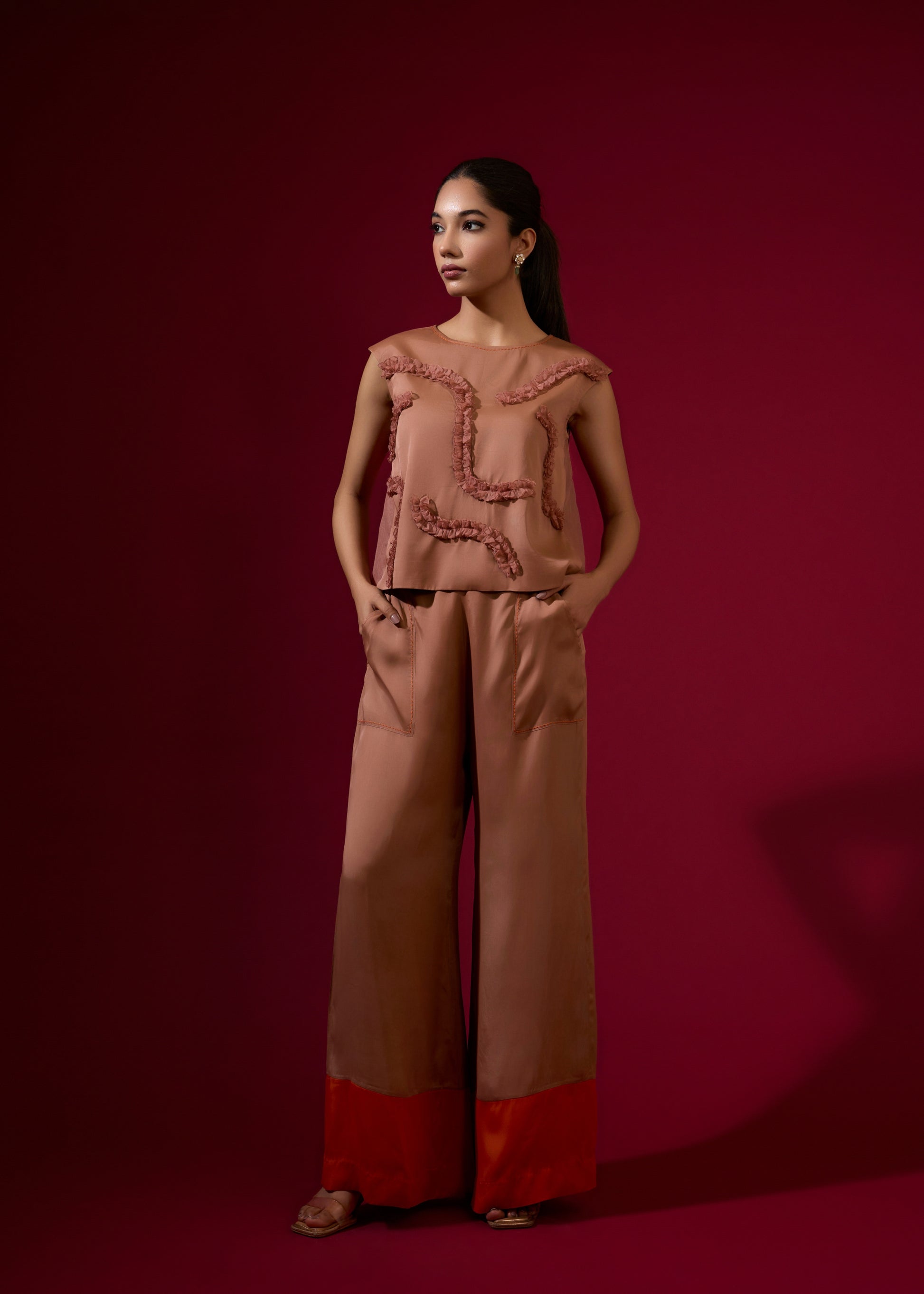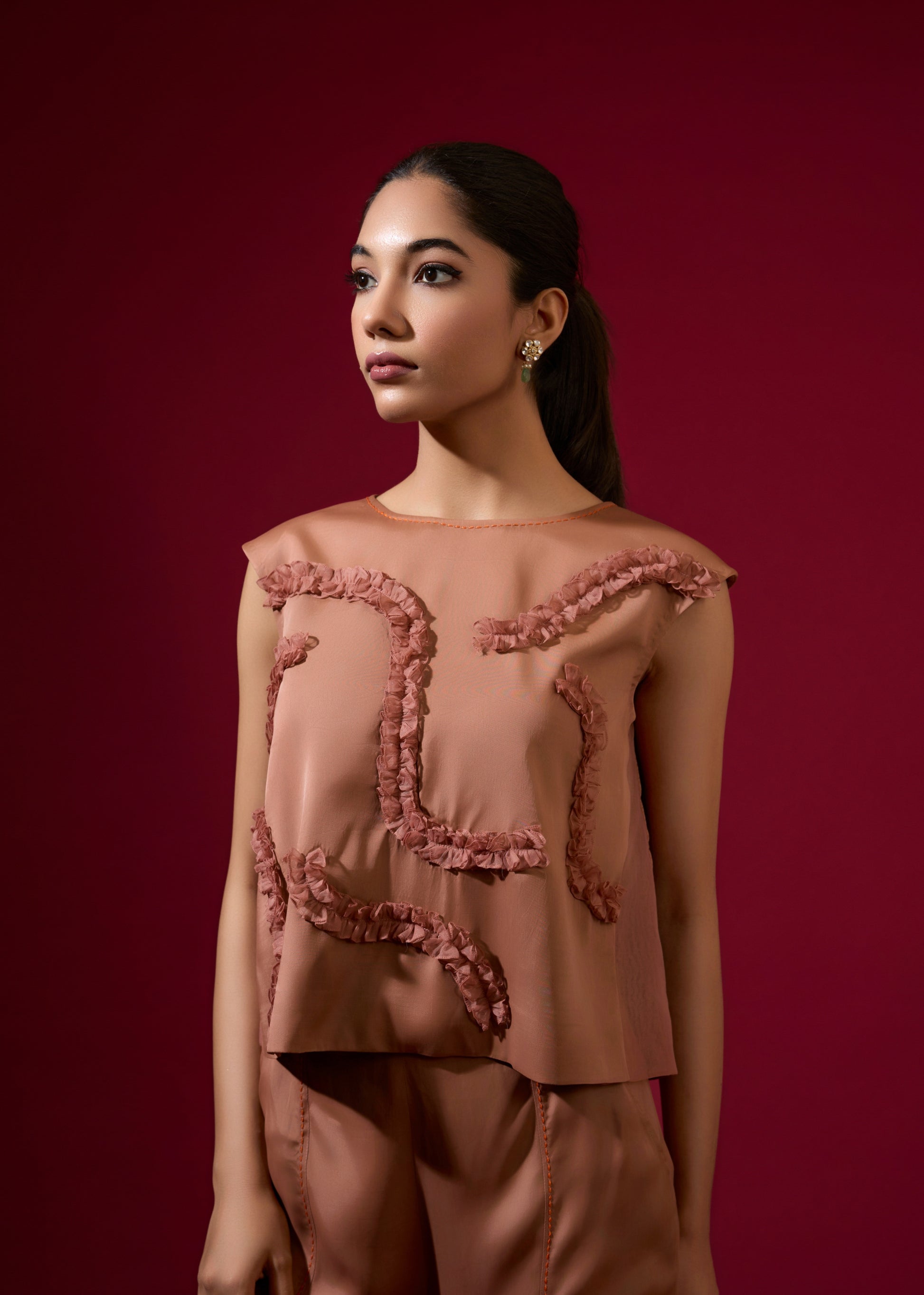 A sleeveless top with structured shoulders, featuring organza ruffles and a contrasting anchor stitch detail at the neckline. Paired with trousers that echo the stitch detail on the pockets, this coord set balances feminine flair with tailored sophistication.
