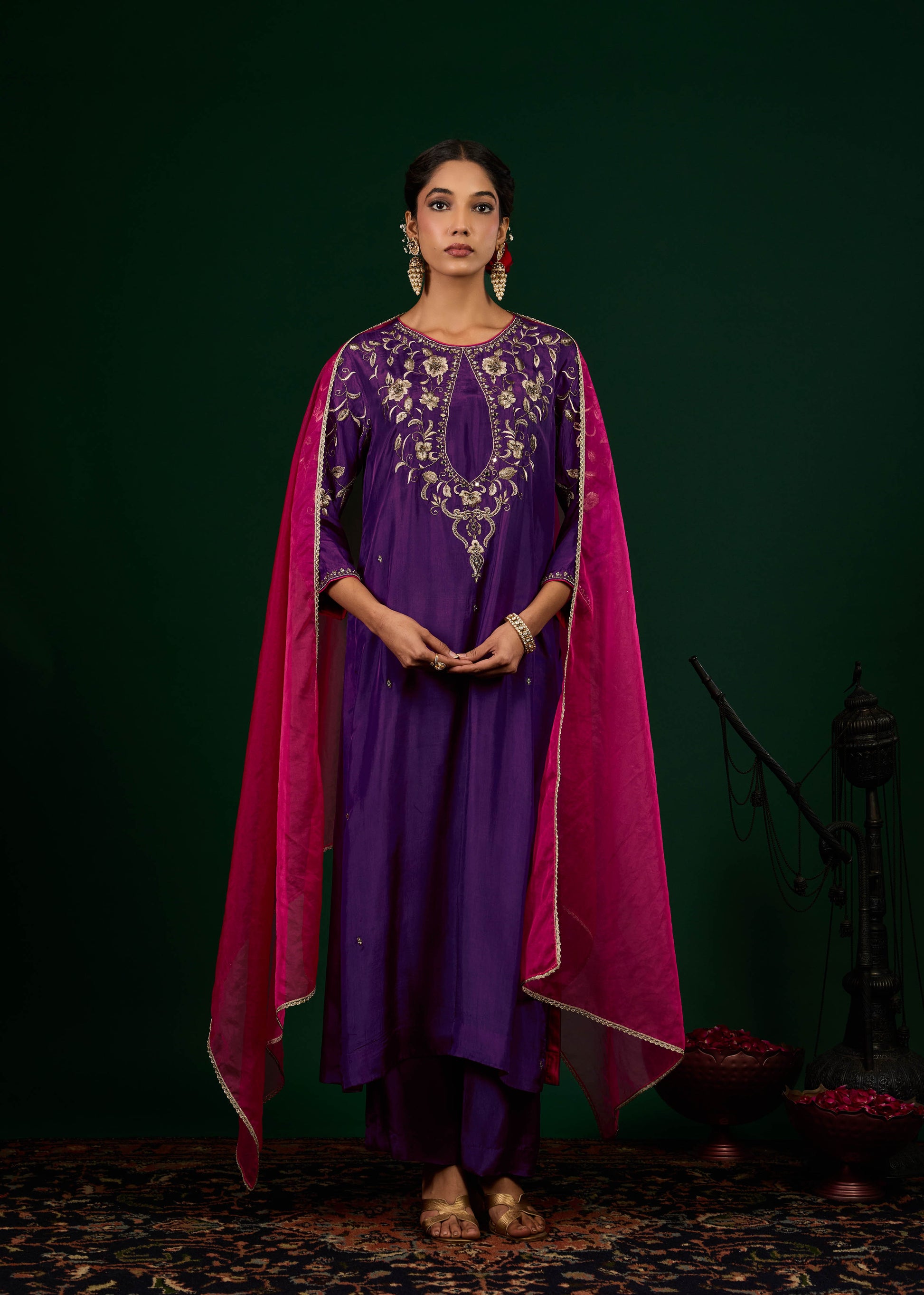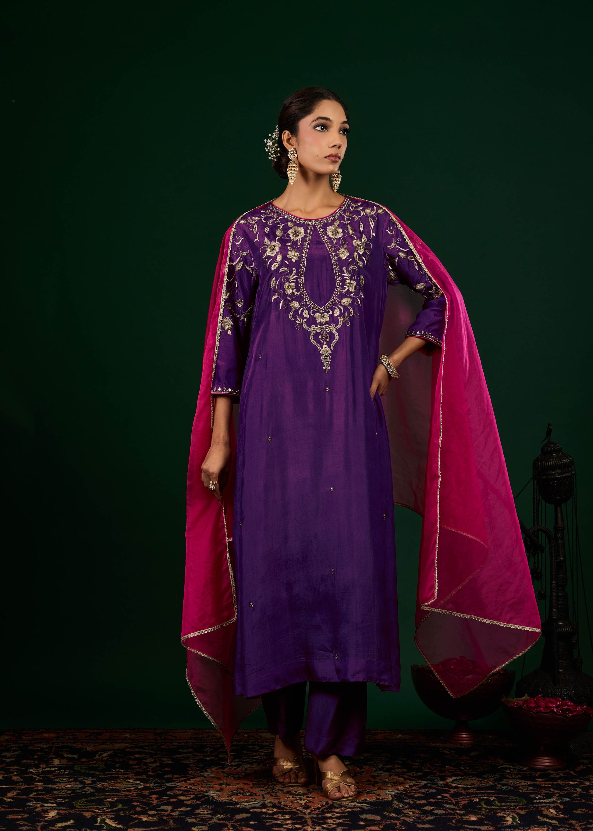 This kurta set features a rich purple straight-cut silhouette, highlighted by a sophisticated keyhole neckline adorned with floral zari embroidery and delicate mirror accents. Crafted in luxurious tabby silk, the ensemble is paired with a contrasting pink organza dupatta, finished with a subtle gold lace border for a refined festive touch.