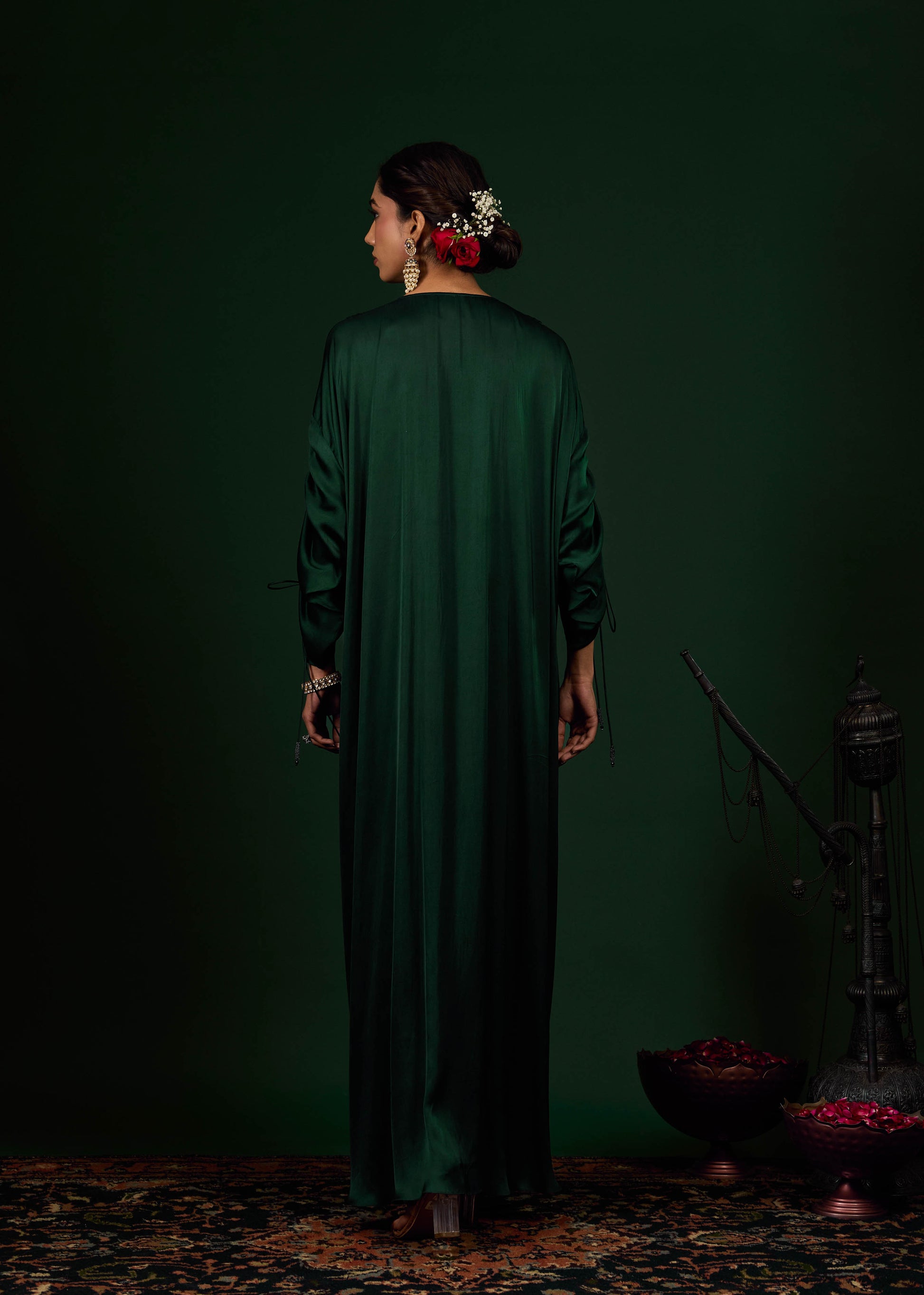 This graceful green kaftan features a fluid, floor-length silhouette crafted in satin that drapes effortlessly. Designed with a deep V-neckline, it is adorned with exquisite floral embroidery patchwork and delicate bead detailing. Soft pleating at the center adds volume and movement, while relaxed sleeves enhance the kaftan’s effortless elegance.
