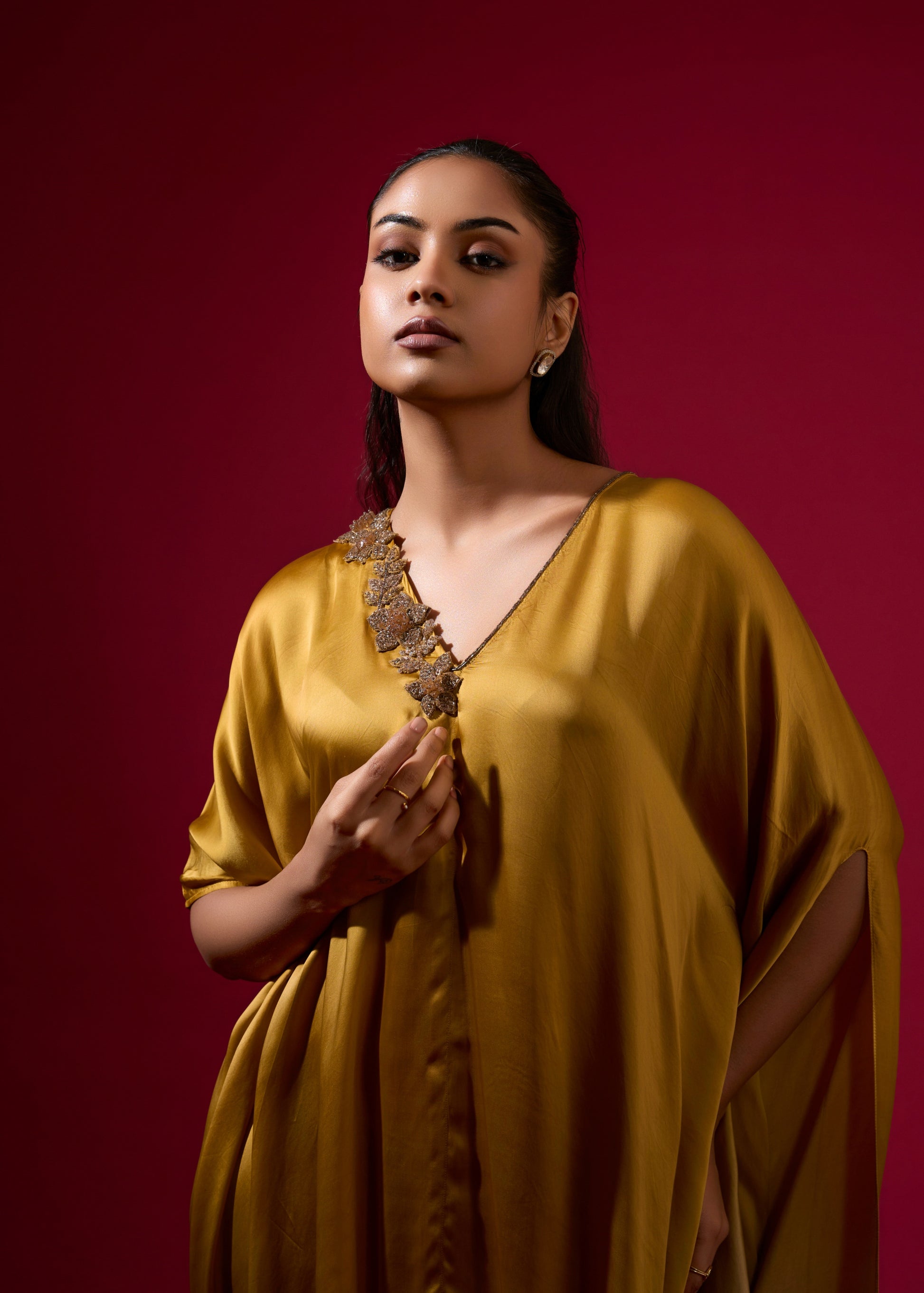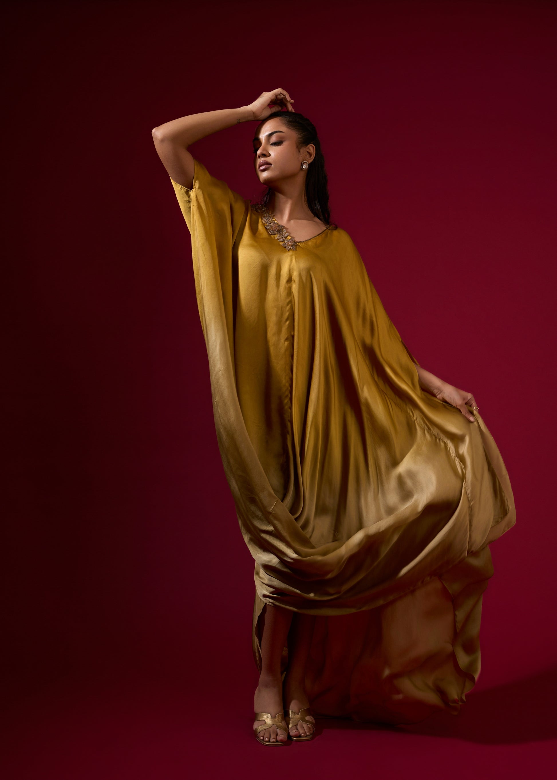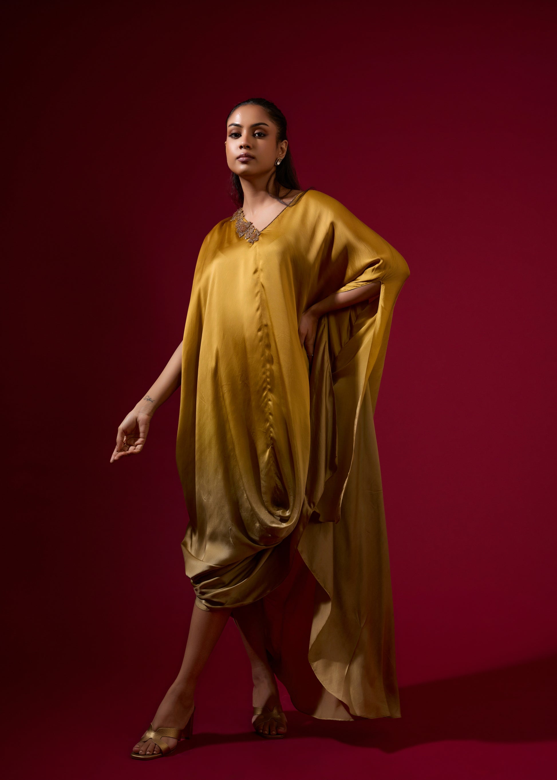A flowy kaftan featuring a soft ombré gradient and a fluid cowl drape silhouette. Accentuated with hand-embroidered 3D floral brooches at the neckline, this piece blends elegance with understated detail – perfect for intimate soirées or quiet celebrations.