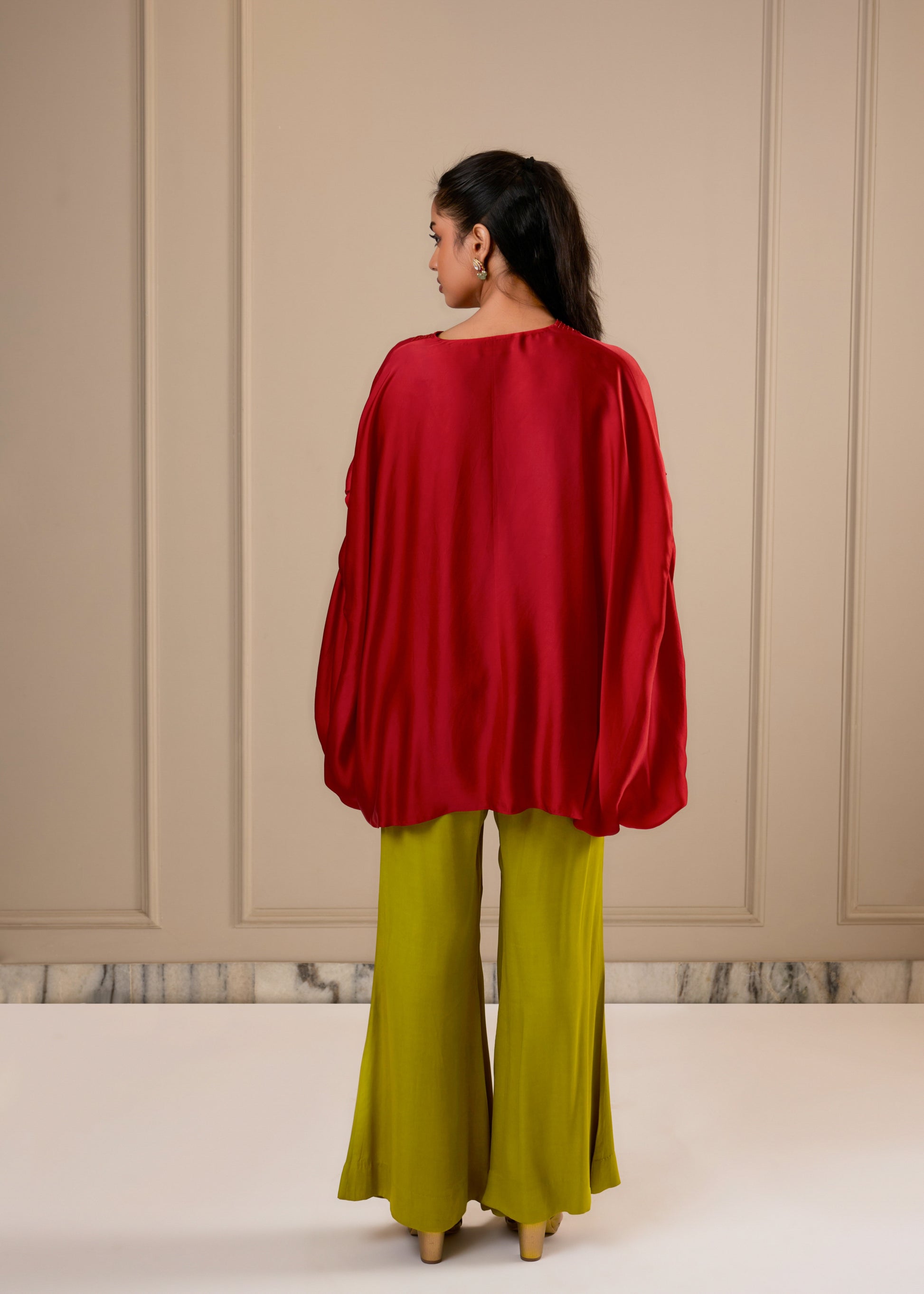 A bold coord set featuring a plunge neckline and batwing sleeves in a striking color block design. Detailed with cutdana work on the collar and a center slit for added flair. Paired with a tailored contrast trousers for a sleek, modern finish.
