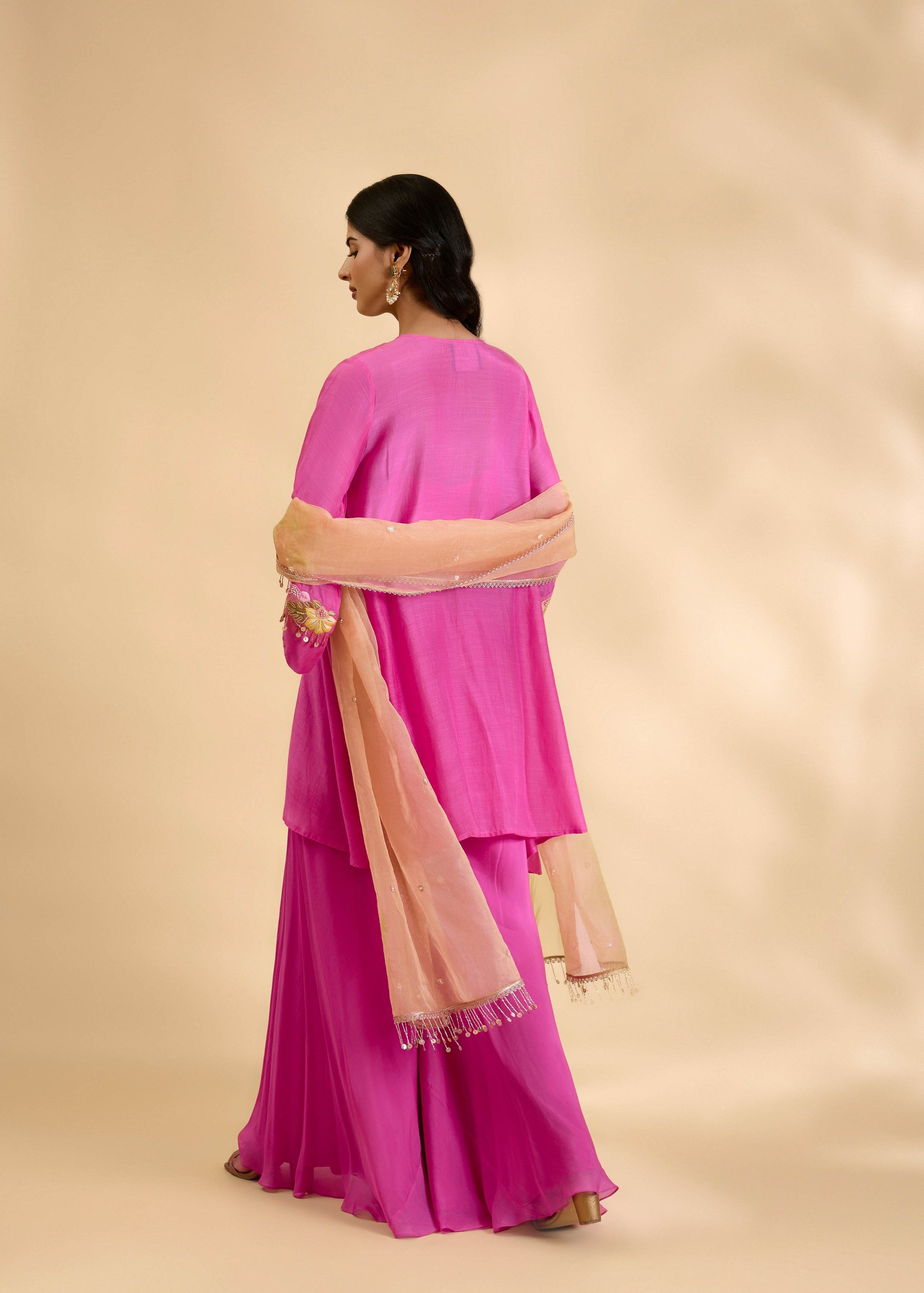 Vibrant yet graceful, the Rani Amaya Sharara Set features a beautiful pink short kurta with a soft, elegant drape. The neckline and yoke are adorned with delicate floral thread and gota embroidery with fine handwork, adding a charming festive detail. Paired with a flowing satin organza sharara and a light green organza dupatta finished with gold edging and delicate embroidery spray, this ensemble brings together freshness and understated elegance—perfect for daytime festivities and celebratory gatherings.