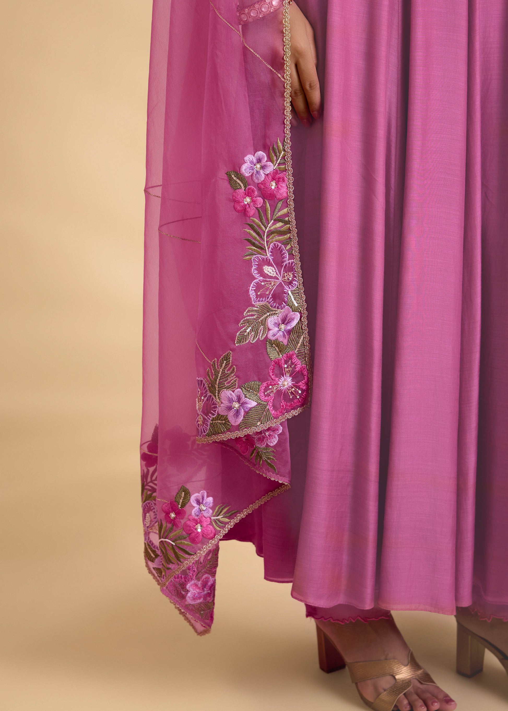 A rich mulberry Anarkali set featuring an ankle-length, softly flared silhouette with graceful movement. The scalloped neckline and yoke are adorned with floral thread embroidery, handwork, and gota detailing, creating an elegant focal point. Paired with straight-cut trousers with scalloped hems and a tonal organza dupatta with embroidered corner borders, this ensemble offers feminine festive charm—perfect for weddings, celebrations, and evening occasions.