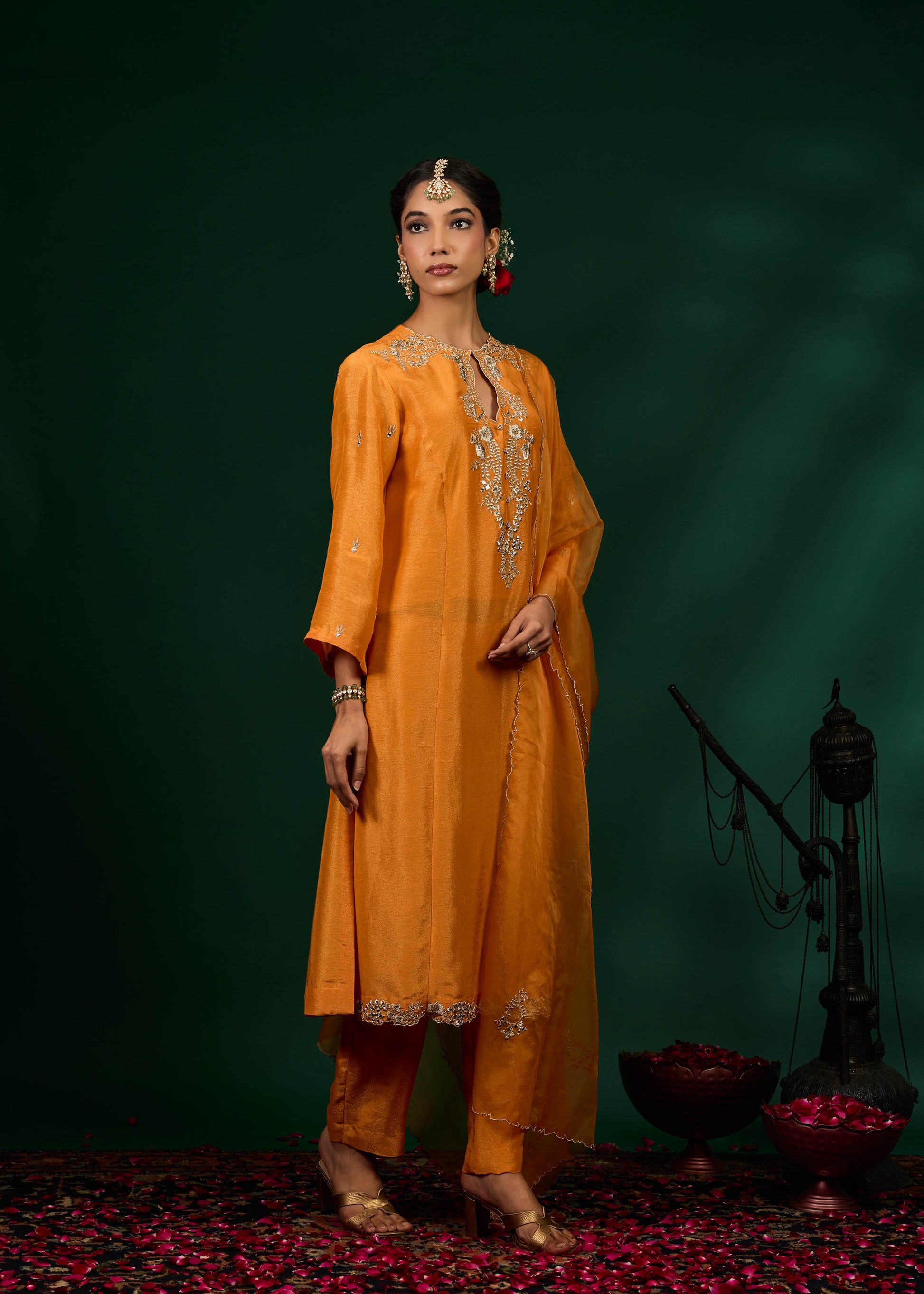 The Mango Taraani Kurta Set features a straight-cut linen tissue kurta with a scalloped neckline, detailed with gold zari floral embroidery and subtle mirror accents along the neckline and ghera. Paired with a tonal organza dupatta featuring embroidered bootas on the sides and an uneven scalloped finish.
