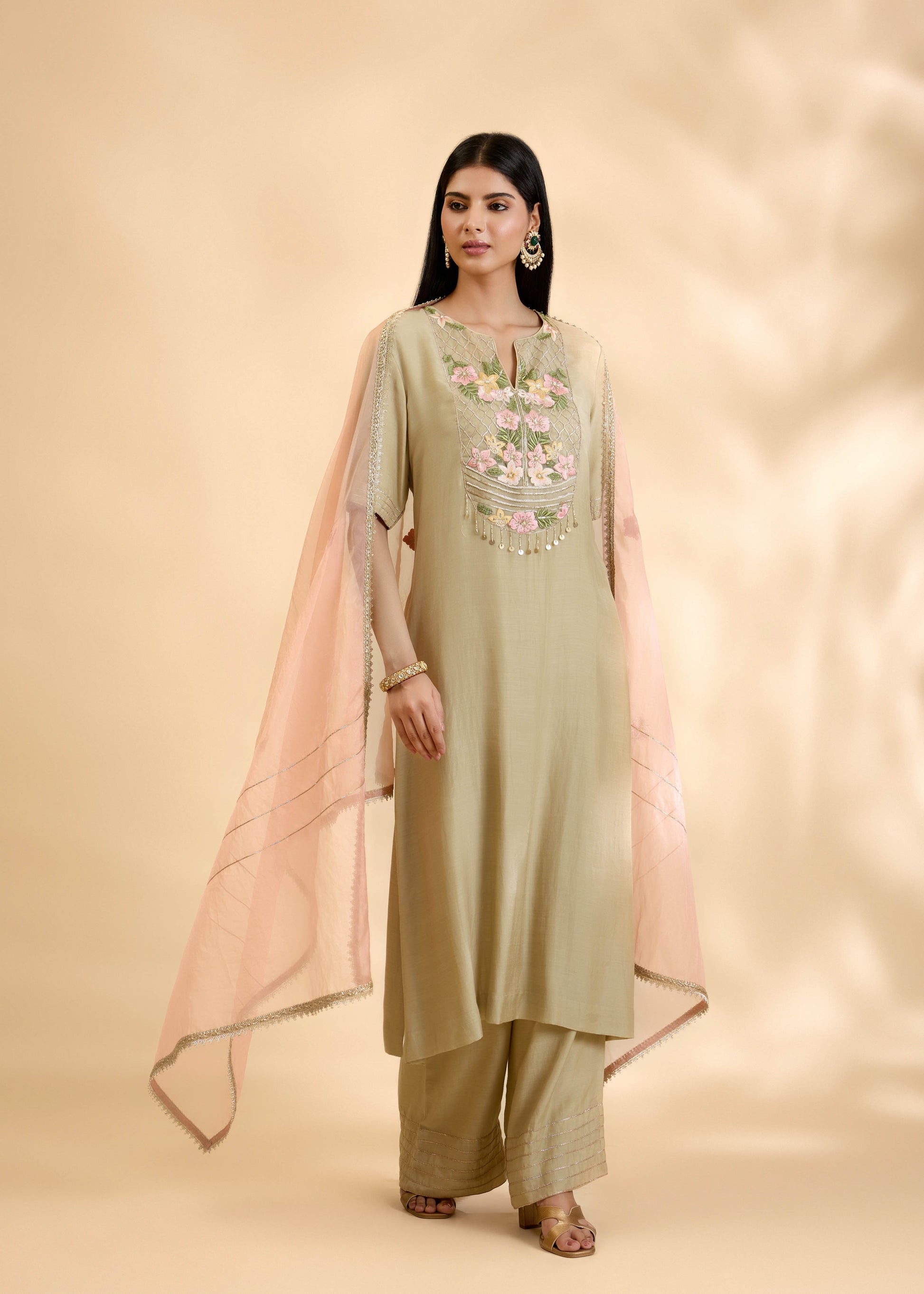 An elegant sage green kurta set featuring a straight silhouette with a soft, fluid drape. The neckline is adorned with pastel floral thread, hand embroidery, and gota work, adding a refined focal detail. Paired with wide-leg palazzo pants with gota detailing at the hem and a blush organza dupatta finished with gold lace and delicate boota embroidery, this ensemble offers understated festive elegance—perfect for daytime celebrations and intimate occasions.